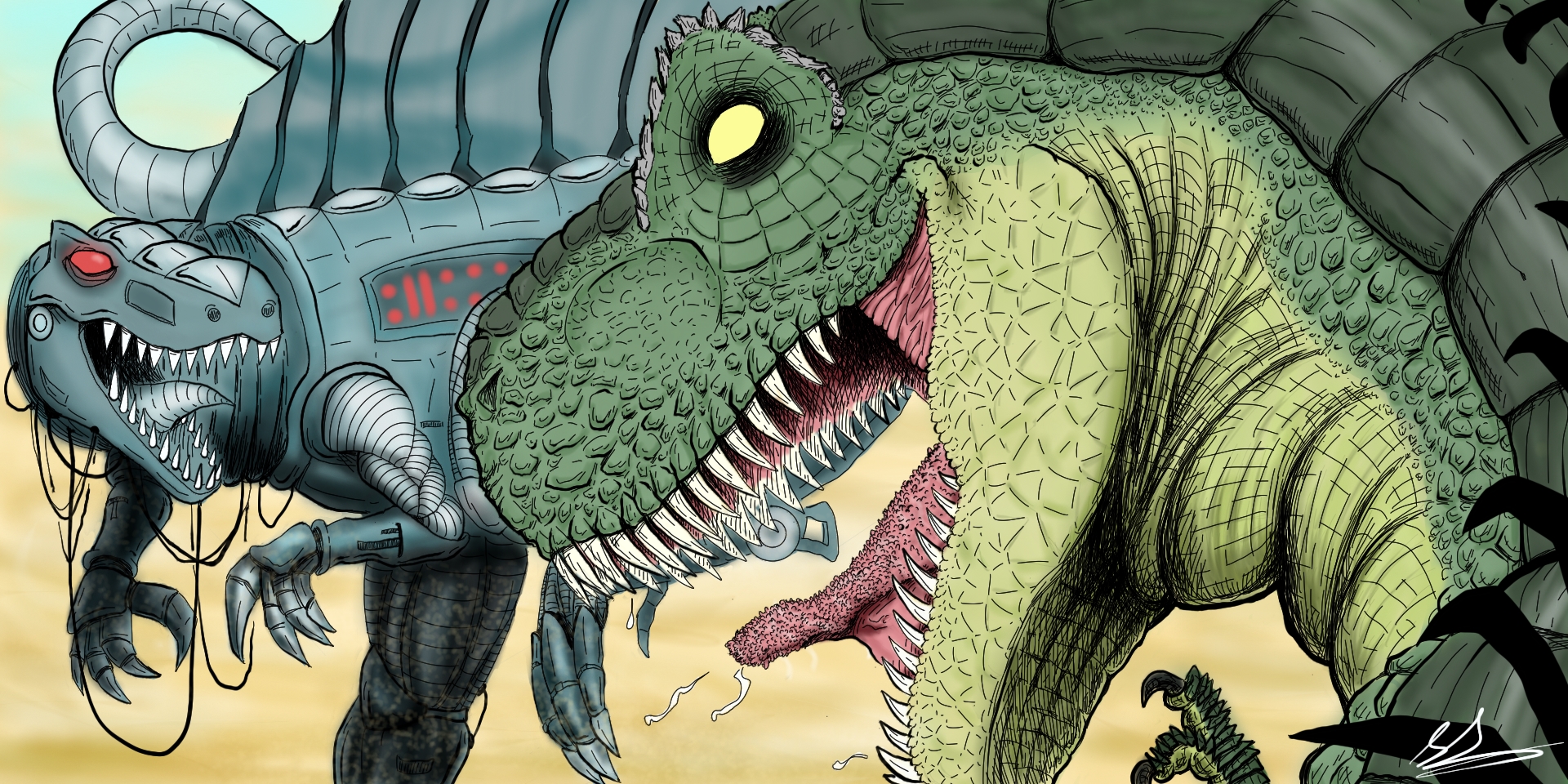 I’m not really sure what made me originally come up with this idea, but it all relates back to this colour illustration I made as an entry in the ” Stan Winston Dinosaur Drawing Competition” in 2013 while I was in the hospital. Even when I was getting a bone marrow transplant I was still drawing!