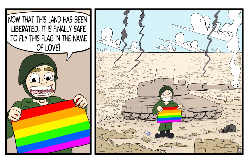 The comic above was inspired by a particular instance relatively near the beginning of the most recent Israeli military campaign of destruction in response to October 7th. An IDF soldier raised up a pride flag amidst the destroyed rubble of Palestinian homes, proclaiming to be raising it in the name of love after having “liberated” the land and making it “safe” for LGBTQ+ people.