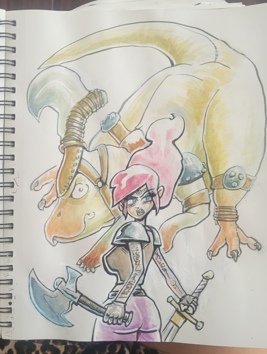 Many of the book’s illustrations were based on my art series, “Lady Dino Knights”, which occupied much of my drawing time in 2022 and 2023. But those dino knights themselves were based off of my world building sketches and notes for my uncompleted graphic novel, Starfist Gemini.