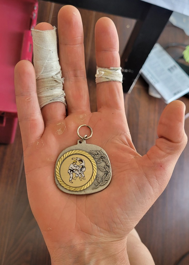 This past weekend I was visiting my mom, and she brought out a silver medal from a judo competition from when I was nine years old. I was a fat little kid who hated everything, and who especially hated being told what to do (funny what effect assigning the wrong gender to a child will have on their behaviour). But as a fat little kid who was practically wider than I was tall, I was really good at judo, despite hating it like I hated everything else people made me do.